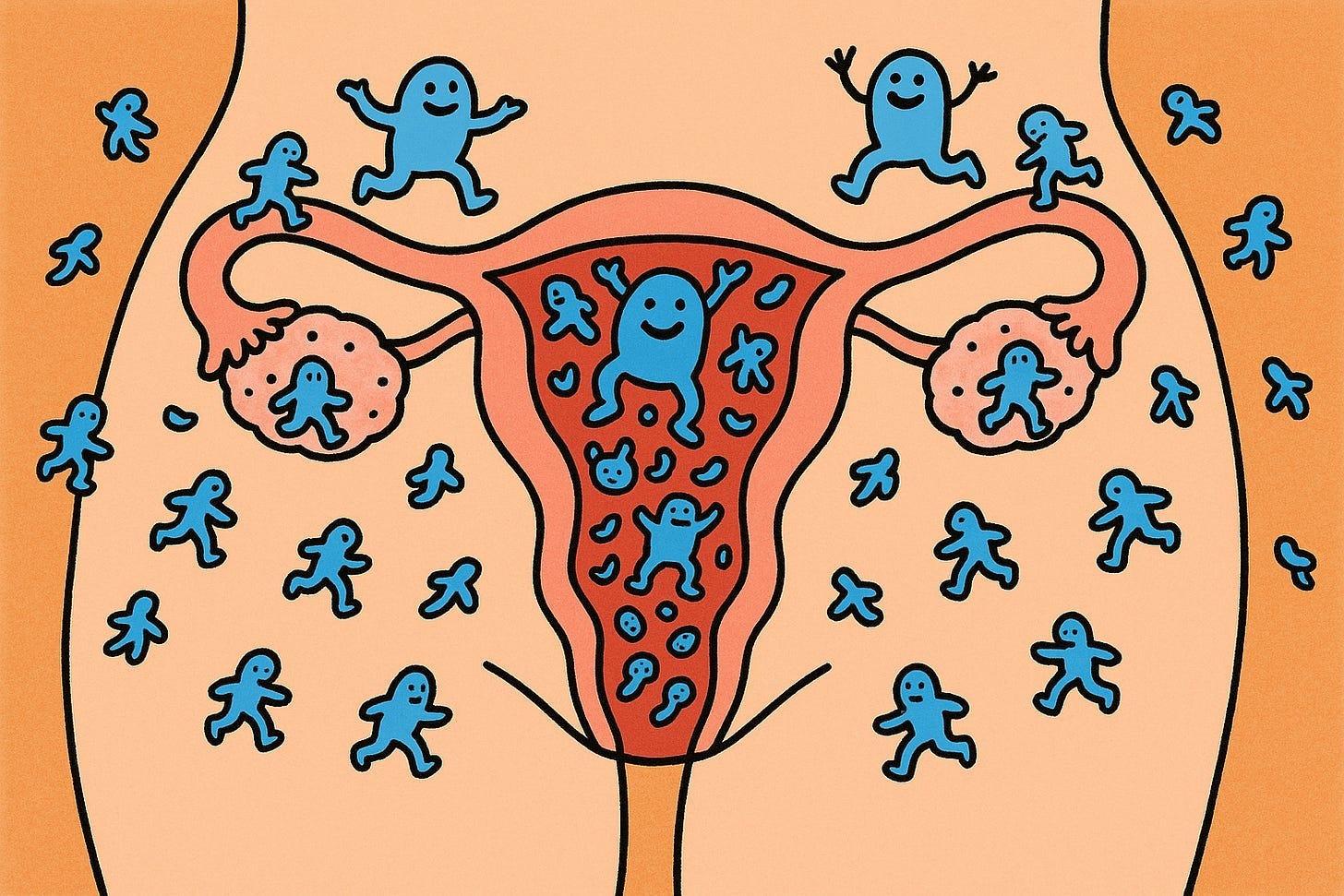 So your uterus has this lining that grows every month, that’s supposed to, you know, stay in the uterus until it gets pushed out as your period. But for some unlucky gals, that lining gets squeezed out the top of the uterus too – into your abdomen, onto your ovaries, your colon, even other parts of your body, God knows where. So now you have little uterus parts all over your body, just waiting for the time of the month when uterus parts respond to a certain hormonal cocktail. When that happens, the jailbroken uterus parts get big and fluffy and inflamed, the same way that the inside of your uterus does right before your period. And that’s why you have all this searing, unbearable cramping — in your uterus. Because of these uterus parts — outside of your uterus.