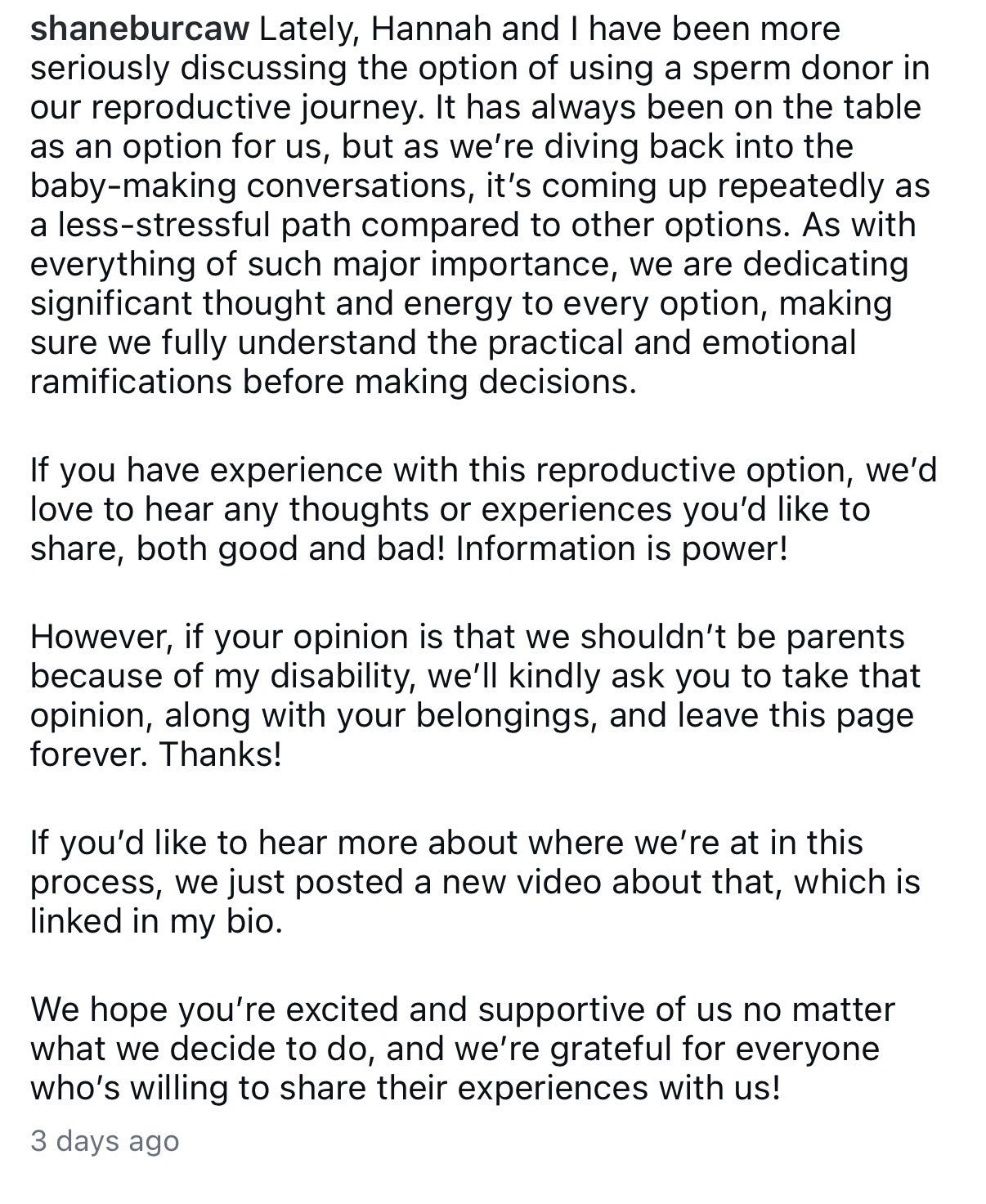For those who don’t know Shane and Hannah Burcaw, they are known as “Squirmy and Grubs” on YouTube and share their lives with the internet as an interabled couple. Shane, also known as “Squirmy”, has Spinal Muscular Atrophy. He and his wife, Hannah, “Grubs”, are advocates against ableism and show the world that disabled men and women can have just as fulfilling and meaningful lives as anyone else. They’ve been sharing their journey as a married couple who hope to grow their family, but have struggled with infertility. Recently, they opened up on Instagram about how they are considering using donor conception on their reproductive journey.