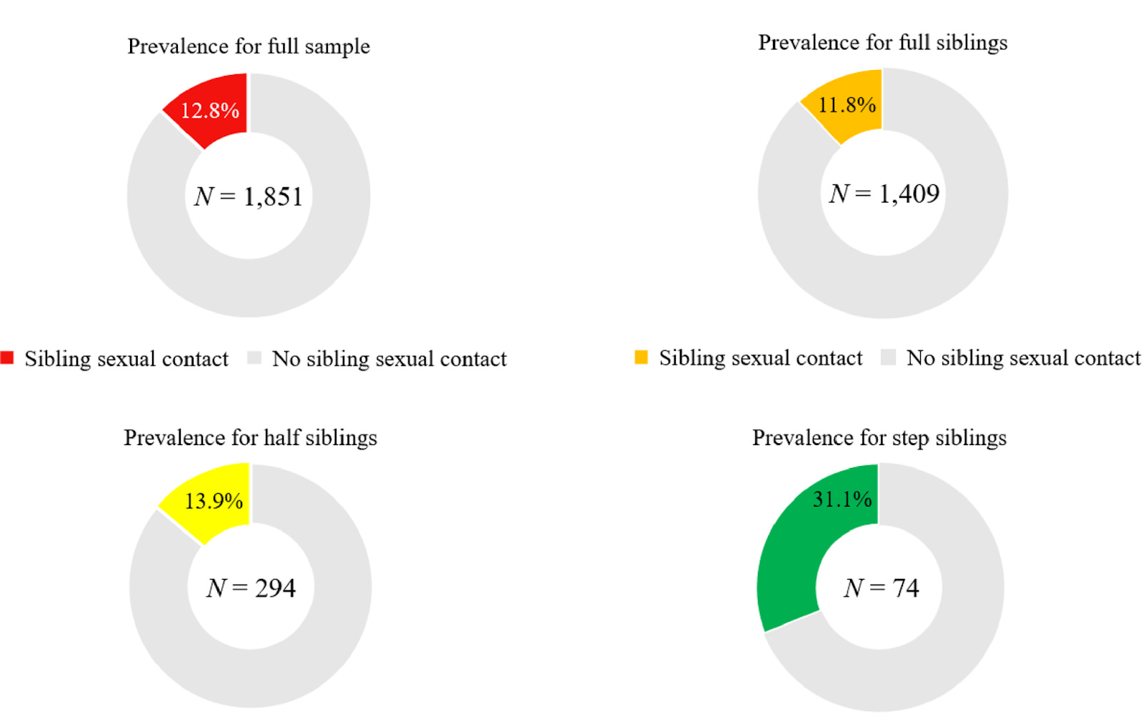Here the biology shows up again. A 2024 study in PLOS ONE surveying over 1,800 adults found that step-siblings and half-siblings reported higher rates of sexual contact than full biological siblings—with rates increasing as genetic relatedness decreased.
