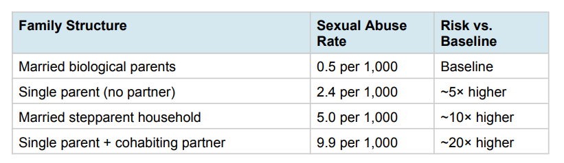 To be clear: “unrelated male” is not a synonym for “predator.” The vast majority of stepfathers and unmarried partners never abuse a child. But at the population level, the absence of a biological bond between a man and a child in his household is a measurable risk factor, and no responsible analysis can ignore a pattern this consistent across this many studies.