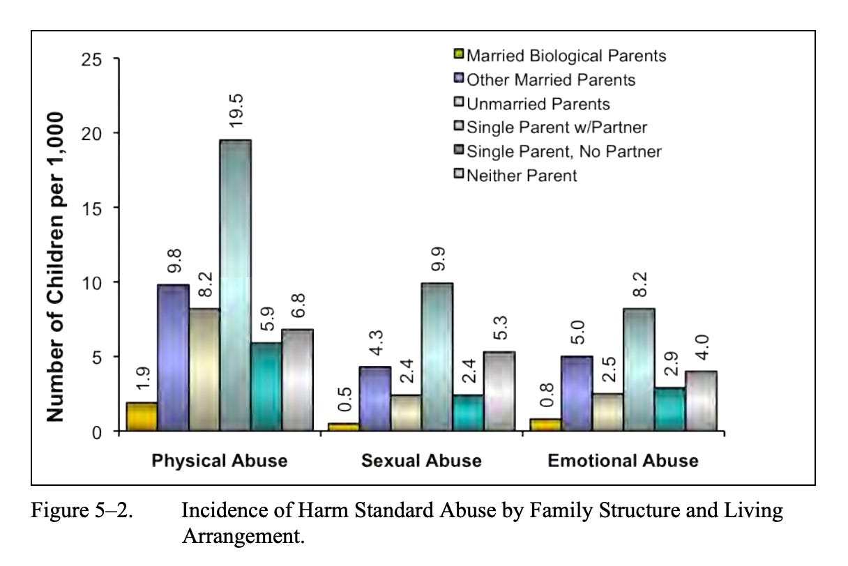The NIS-4 doesn’t treat stepfathers and boyfriends as interchangeable, and neither should we. A married stepfather, a man with legal commitment to the family, is associated with roughly ten times the baseline risk. An unmarried boyfriend, cohabiting without that commitment, is associated with roughly twenty times the baseline risk. Both figures are dramatically elevated compared to a biological father. But the boyfriend is twice as dangerous as the stepfather.